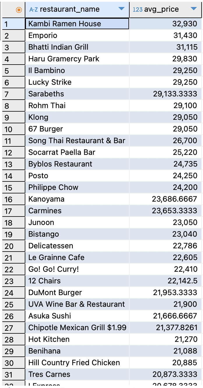 SELECT restaurnat_name, AVG(name) avg_price