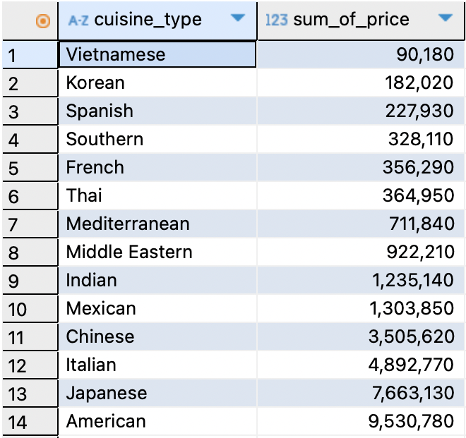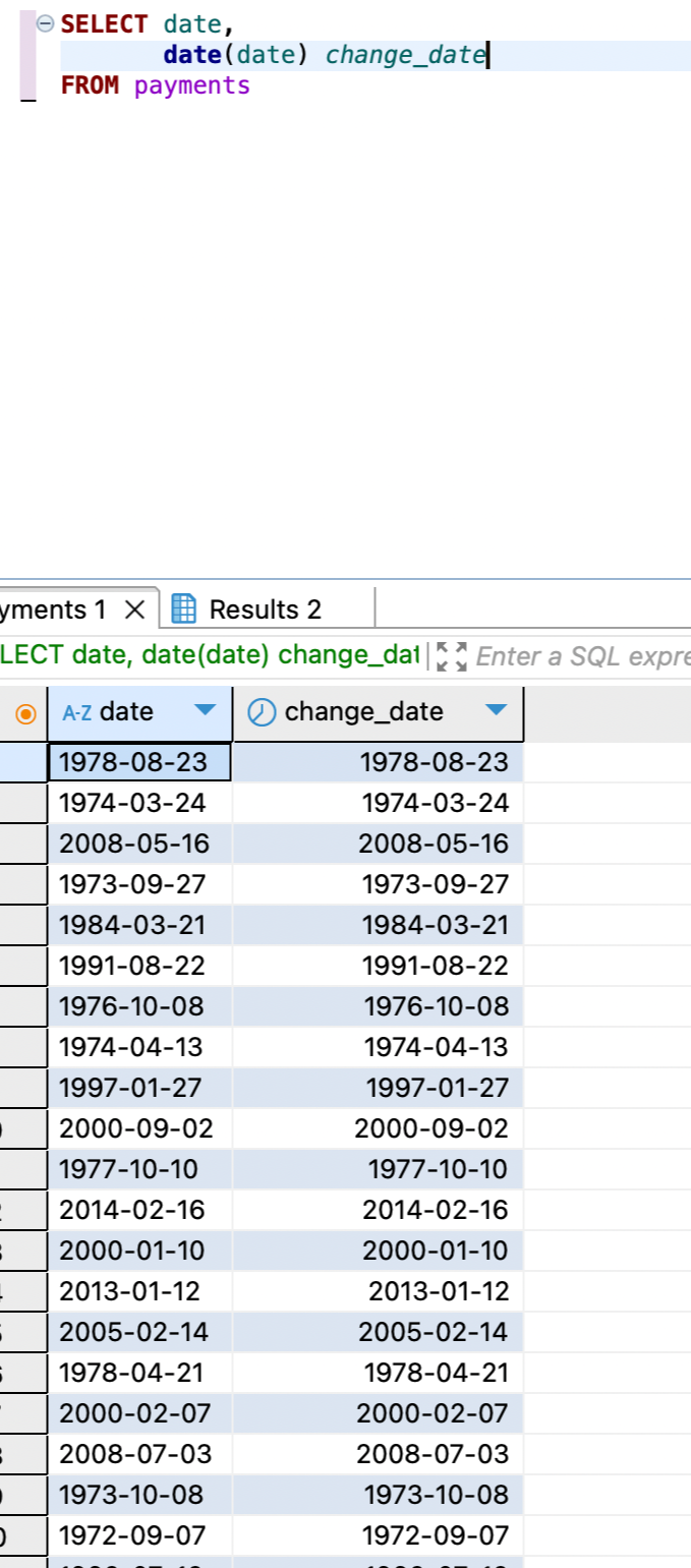 날짜 데이터 (date_type) 칼럼명 앞에 아이콘을 확인하자 ! 문자열 데이터는 A-Z, 날짜 데이터는 시계 아이콘이 있다. -연, 월, 일, 시, 분, 초 등의 값을 모두 갖고 있으며 목적에 따라 '월', '주', '일' 등으로 포맷 변경 가능 ! 년 : Y(4자리), y(2자리)월 : M, m일 : d, e요일 : w 날짜 데이터, 년, 월. 일, 요일 칼럼으로 포맷 변경SELECT DATE(date) date_type, DATE_FORMAT(DATE(date), '%Y') "년", DATE_FORMAT(DATE(date), '%m') "월", DATE_FORMAT(DATE(date), '%d') "일", DATE_FORMAT(DATE(date..